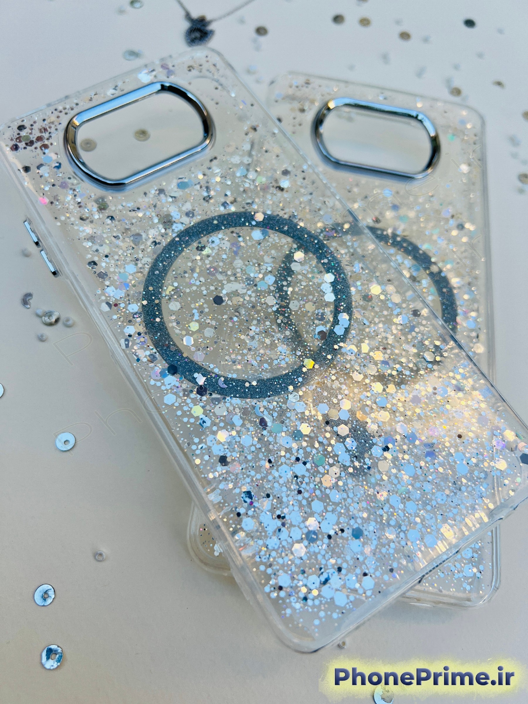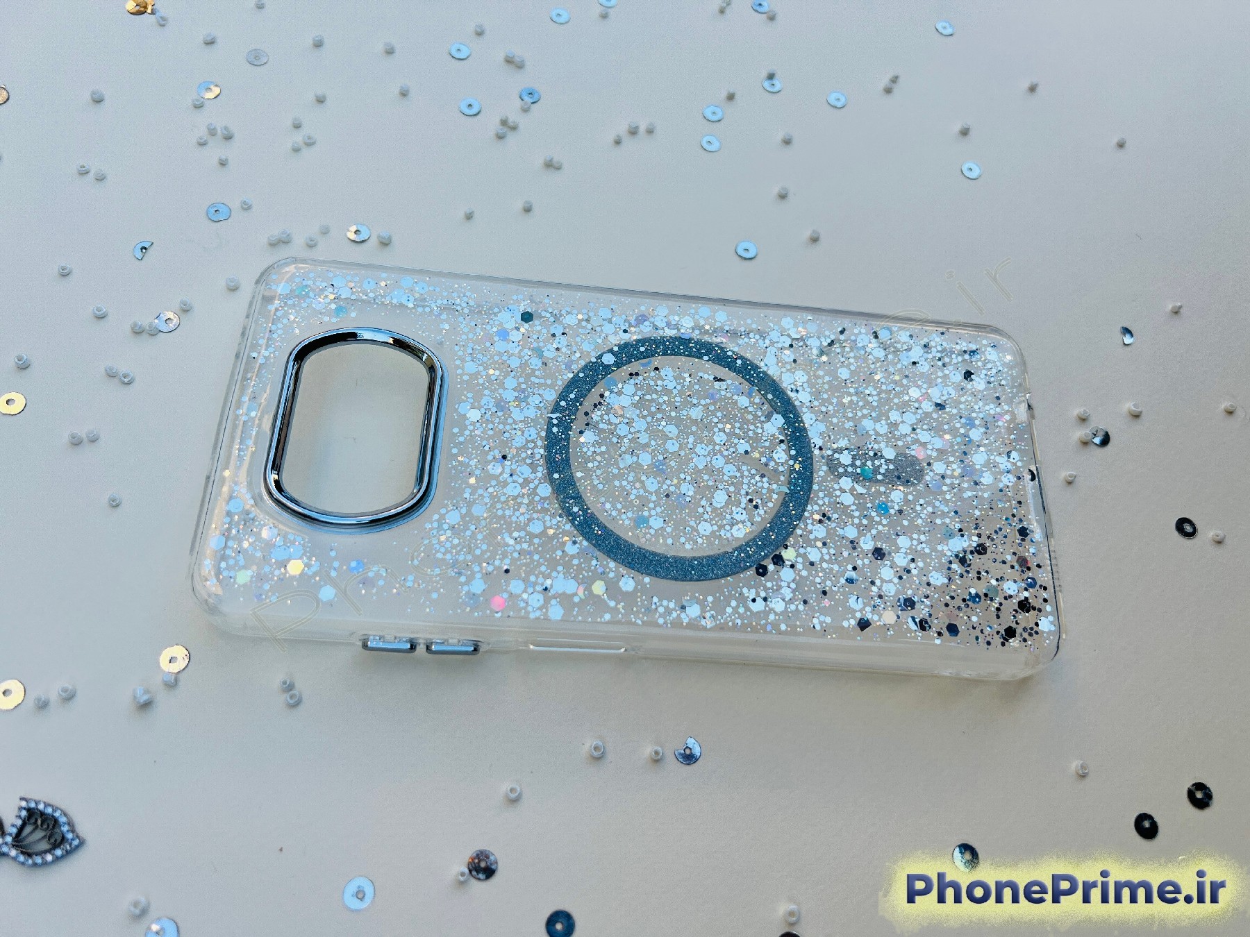 پشت قاب کاملاً شفاف است تا رنگ اصلی گوشی پوکو X3 دیده شود، اما در عین حال با لایهای از اکلیل و پولکهای ریز و درشت شاین نقرهای تزئین شده که زیر نور، جلوهای فوقالعاده درخشان ایجاد میکند. این شاینها ثابت هستند و با گذر زمان نمیریزند، و همین باعث میشود قاب همیشه ظاهر نو، براق و چشمگیر خود را حفظ کند.