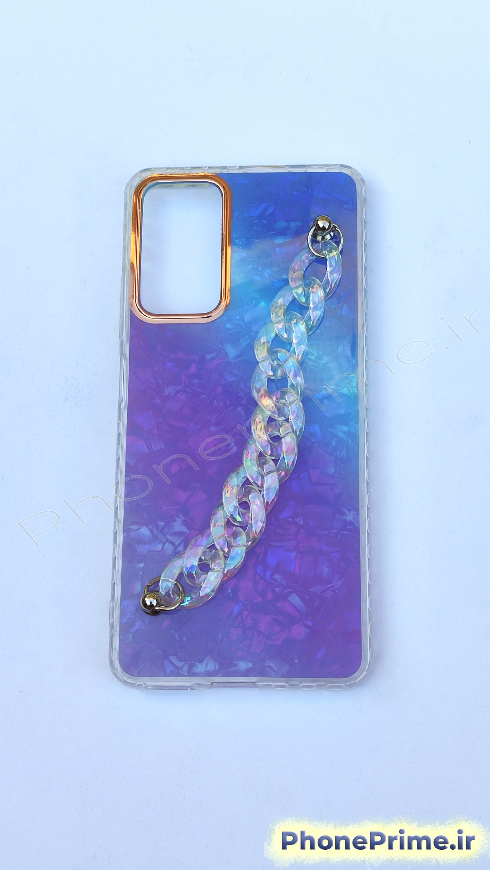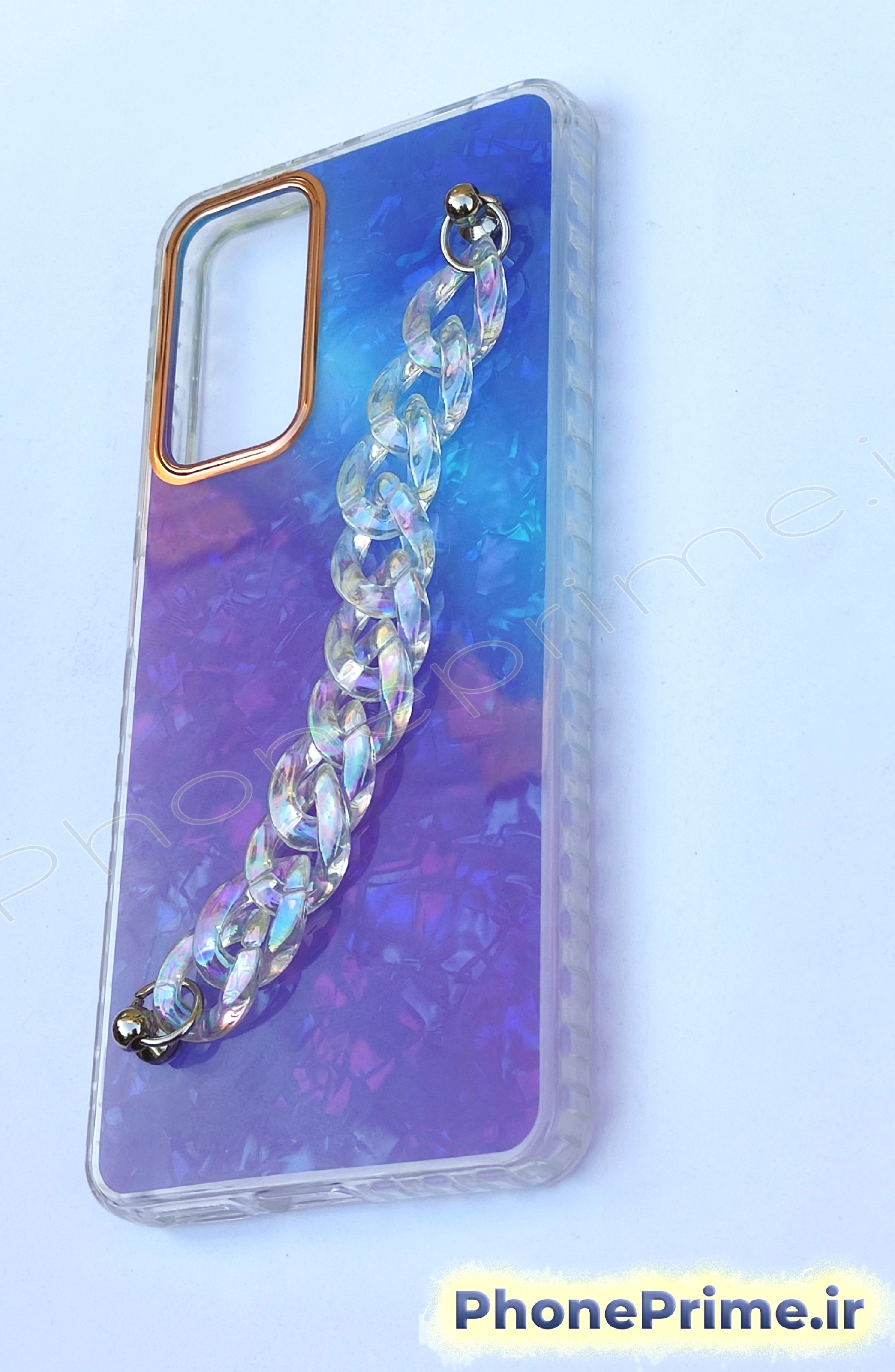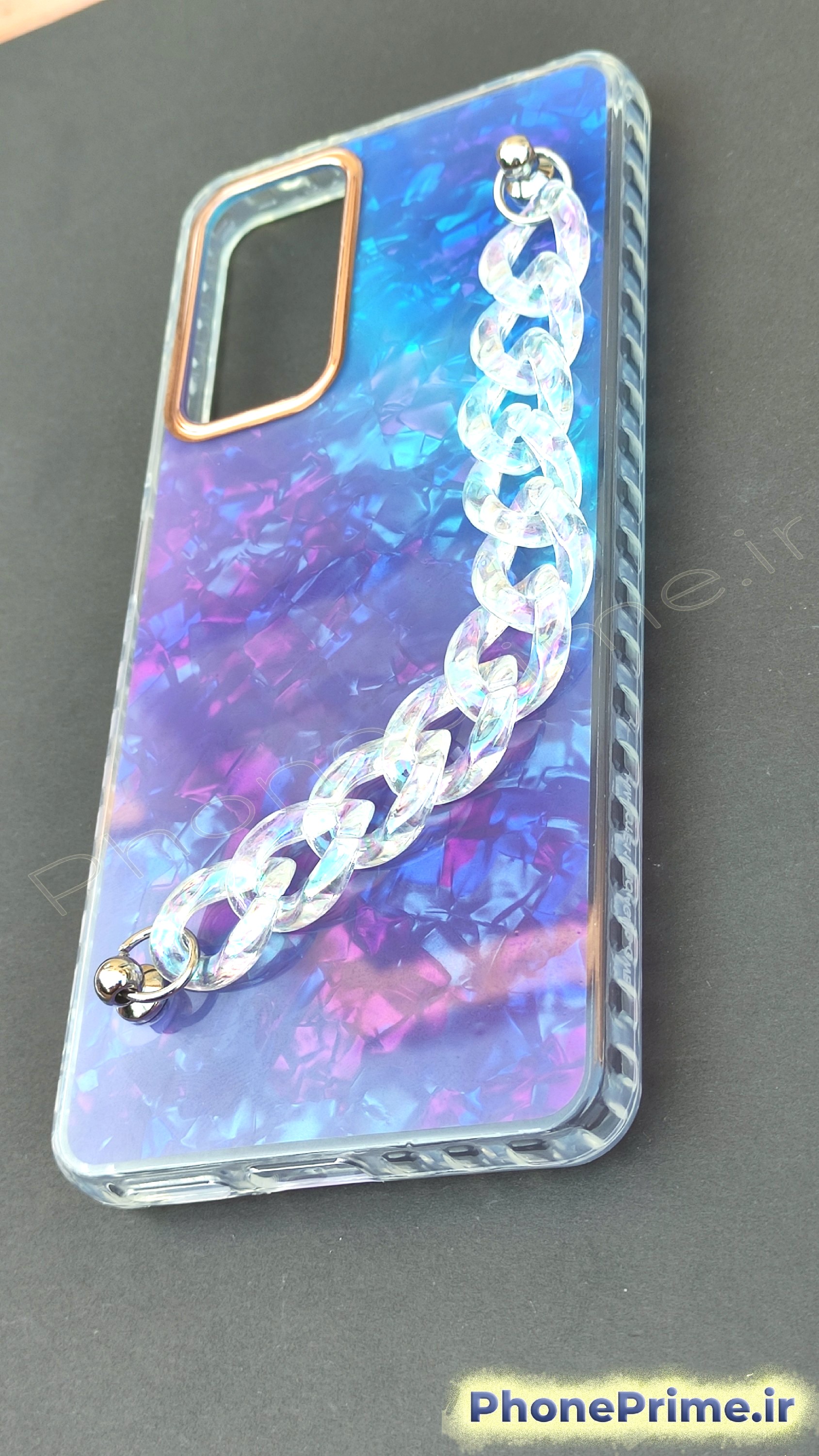 از بالای کاور تا پایین آن یک زنجیر پلاستیکی باکیفیت نصب شده که هم جنبه تزئینی دارد و هم میتواند برای در دست گرفتن گوشی یا آویزان کردن آن استفاده شود. این زنجیر نه ترک میخورد، نه تغییر رنگ میدهد و مقاومت خوبی در طول استفاده روزمره دارد.