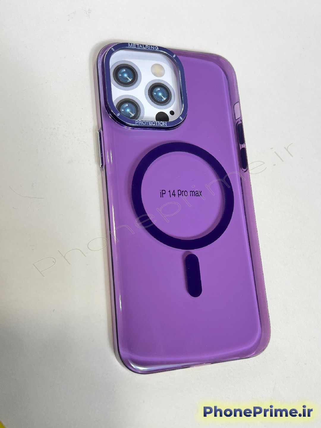 قاب آیفون 14 پرومکس (iPhone 14 Pro Max) مدل لوکس شیشهای به رنگ بنفش (Purple). این کاور مجهز به حلقه مگ سیف (Magsafe) با قابلیت شارژ بیسیم سریع و آهنربای قوی است. ویژگی متمایز این قاب، فریم لنز تیتانیومی برآمده است که محافظت کاملی از دوربینهای شما به عمل میآورد. امکان خرید نقد و اقساط در فون پرایم فراهم است.