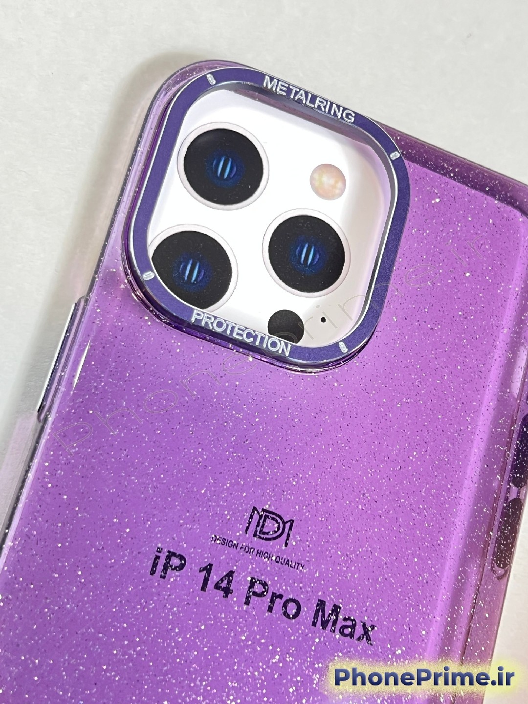 فریم لنز تیتانیومی بنفش: یکی از نقاط قوت این قاب گوشی، بخش محافظ دوربین آن است. یک فریم از جنس تیتانیوم به رنگ بنفش متالیک دور تا دور لنزها را احاطه کرده است. این فریم نه تنها با رنگ بنفش شاین بدنه کاملاً ست شده و ظاهری حرفهای به گوشی میدهد، بلکه به دلیل استحکام بالای تیتانیوم، از لنزهای آیفون ۱۴ پرومکس در برابر شدیدترین ضربهها و برخوردهای مستقیم محافظت میکند.