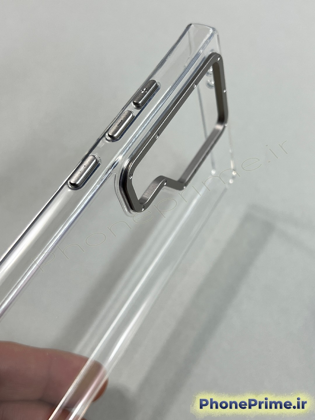 طراحی مینیمال و ارگونومیک: این قاب فاقد حلقه مغناطیسی مگسیف است که باعث شده پشت قاب کاملاً صاف و یکدست باقی بماند. ضخامت کم قاب و طراحی دقیق دکمهها، حس استفاده از گوشی بدون قاب را منتقل کرده و دسترسی به قلم S-Pen به راحتی امکانپذیر است.
