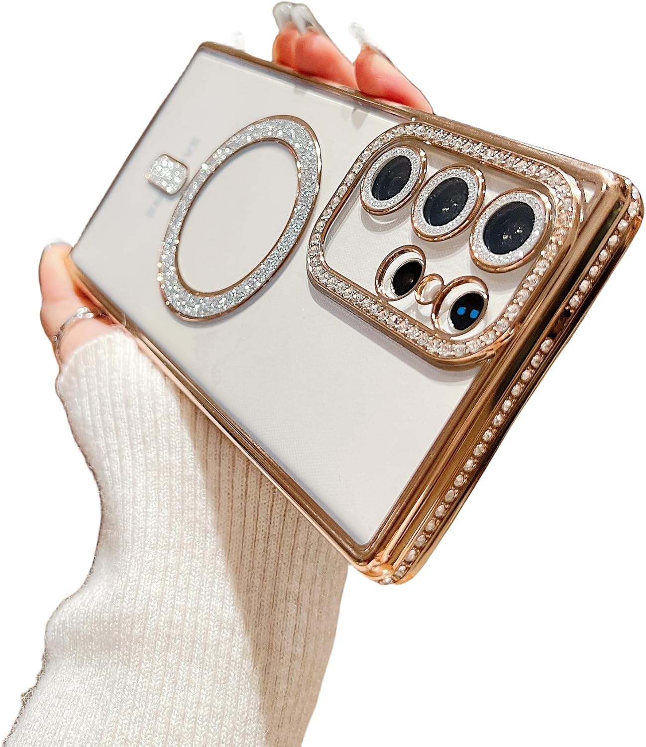 رینگ مگنتی کاربردی: رینگ تعبیه شده در پشت قاب با پوشش اکلیلی/نگینی، علاوه بر زیبایی، به عنوان یک المان مگنتی عمل کرده و به استایل مگسیف (MagSafe) گوشیهای لوکس نزدیک است. بدنه شفاف قاب نیز از زیبایی اصلی طراحی A55 محافظت میکند بدون آنکه آن را پنهان کند.