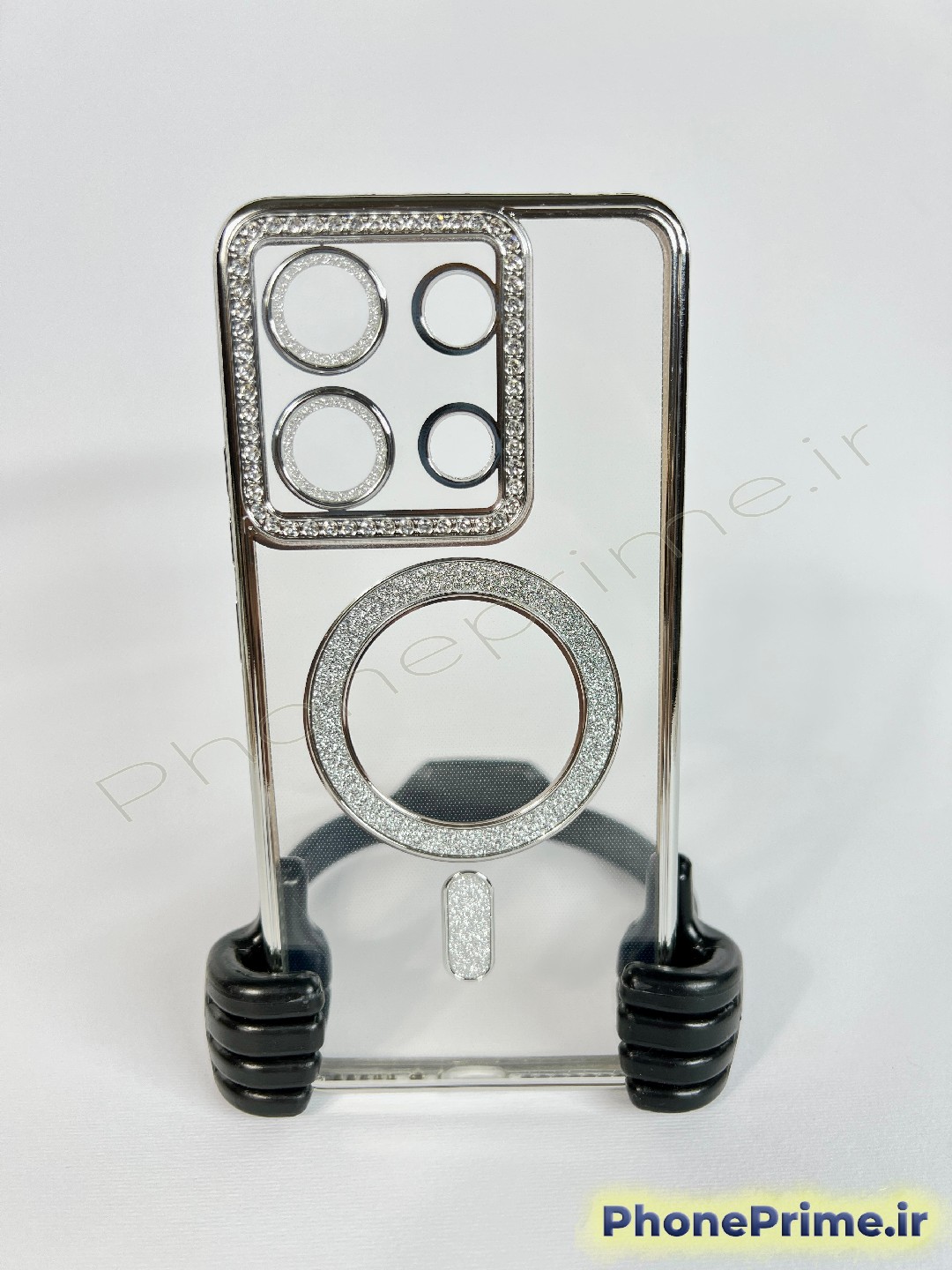 رینگ مگنتی کاربردی: رینگ تعبیه شده در پشت قاب با پوشش اکلیلی/نگینی، علاوه بر زیبایی، به عنوان یک المان مگنتی عمل کرده و به استایل مگسیف (MagSafe) گوشیهای لوکس نزدیک است. بدنه شفاف قاب نیز از زیبایی اصلی طراحی Note 13 Pro 4G محافظت میکند بدون آنکه آن را پنهان کند.