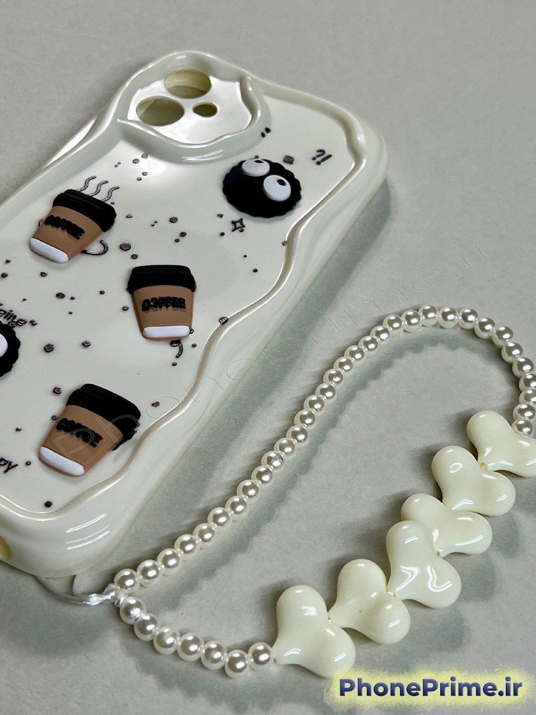 آویز مروارید و قلب (Lanyard): جذابترین بخش این قاب، آویز متصل به آن است که ترکیبی از مرواریدهای براق و قلبهای حجیم سفید است. این آویز علاوه بر زیبایی، امنیت گوشی را در هنگام دست گرفتن افزایش میدهد.