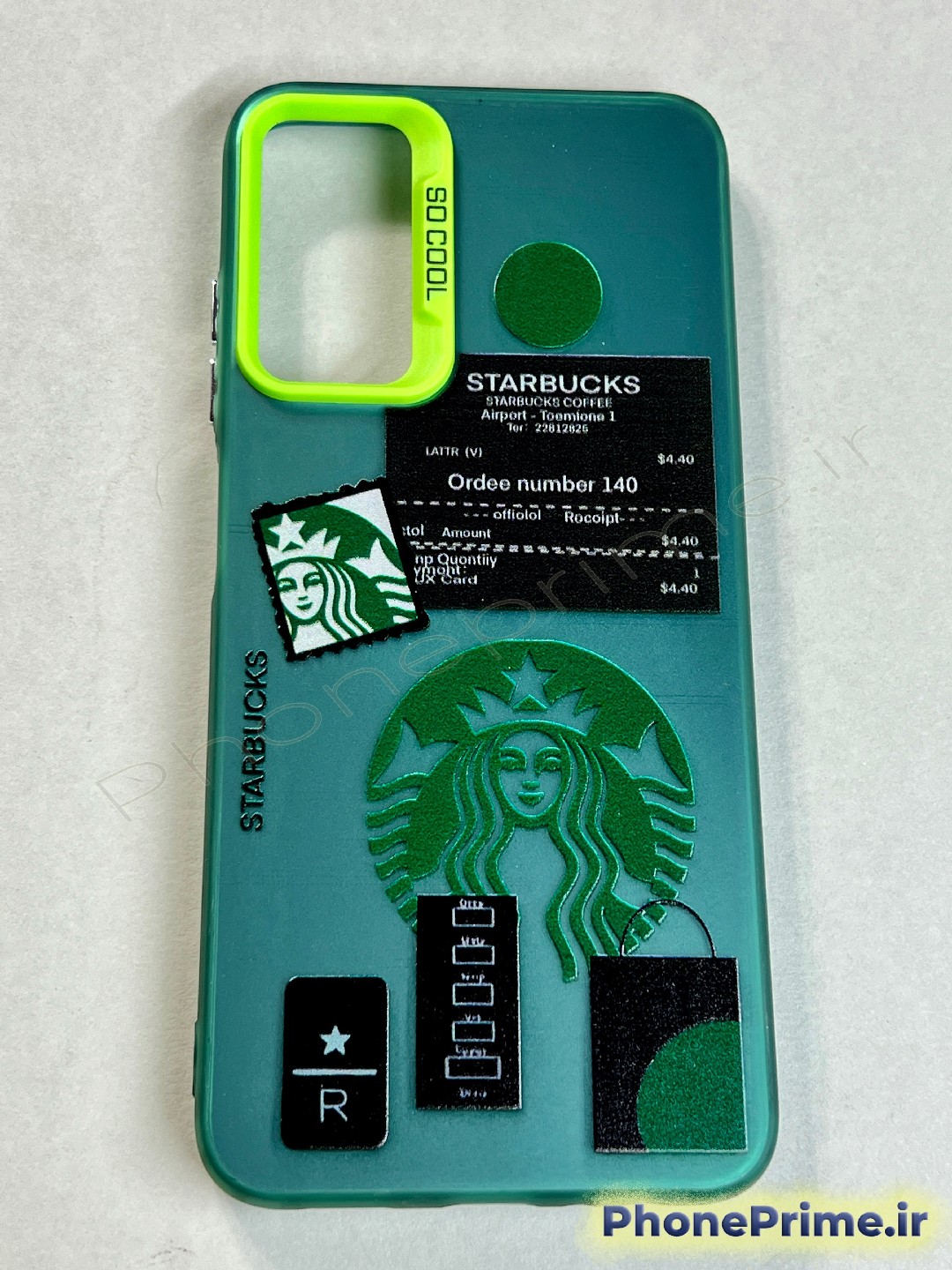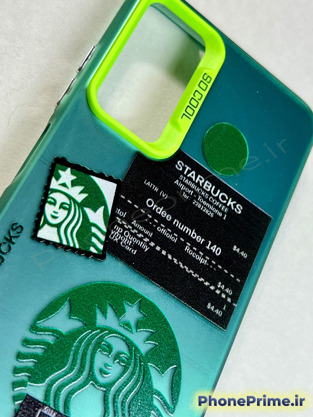طرح استارباکس (Starbucks Edition): طرح روی قاب شامل لوگوی استارباکس، فاکتور خرید فانتزی (Order number 140) و آیکونهای مرتبط با قهوه است که با دقت بسیار بالا و به صورت ماندگار چاپ شدهاند.