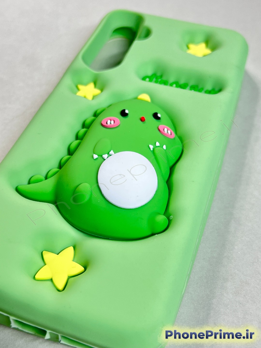 طرح دایناسور سه بعدی (3D Design): دایناسور بزرگ و سبز رنگ روی قاب به همراه ستارههای زرد به صورت کاملاً برجسته طراحی شدهاند که نه تنها زیبایی قاب را دوچندان کرده، بلکه باعث میشود گوشی از دست شما سر نخورد.