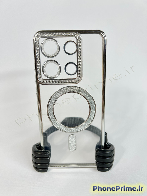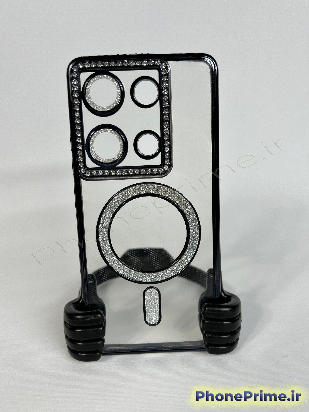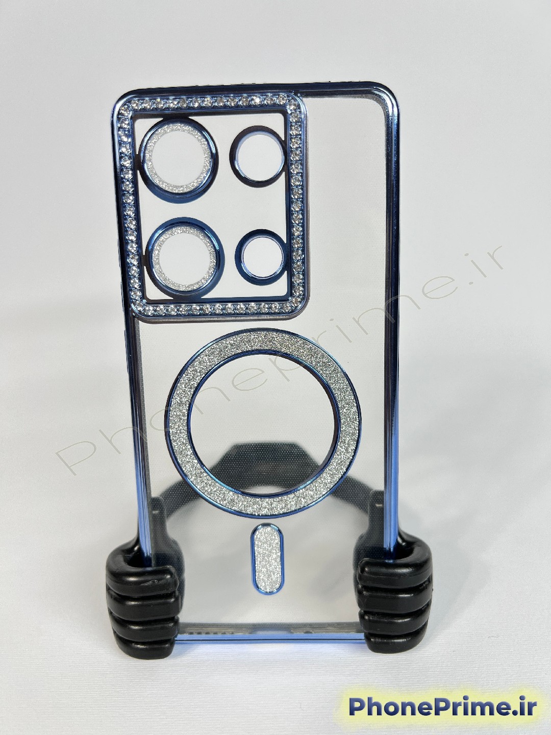 رینگ مگنتی کاربردی: رینگ تعبیه شده در پشت قاب با پوشش اکلیلی/نگینی، علاوه بر زیبایی، به عنوان یک المان مگنتی عمل کرده و به استایل مگسیف (MagSafe) گوشیهای لوکس نزدیک است. بدنه شفاف قاب نیز از زیبایی اصلی طراحی Note 14 4G محافظت میکند بدون آنکه آن را پنهان کند.