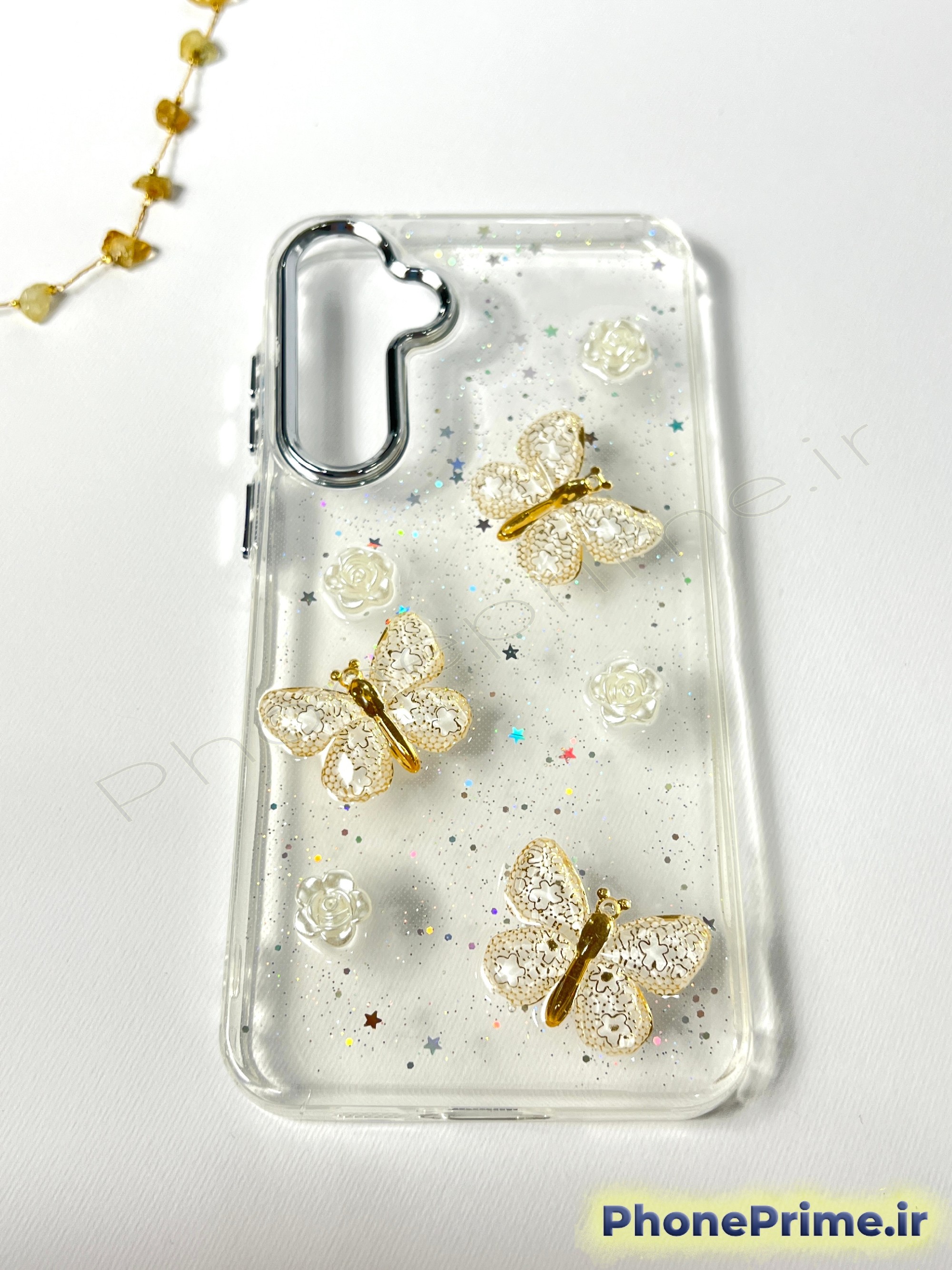 طراحی پروانههای برجسته 3D در کنار جلوه شاین و براق ظریف، نمایی خاص و چشمنواز به گوشی میدهد، بدون اینکه رنگ یا طراحی اصلی آیفون پنهان شود. این قاب نه زود کدر میشود و نه حس ارزانبودن منتقل میکند؛ کاملاً مناسب کسانی است که ظاهر گوشی برایشان اهمیت دارد.