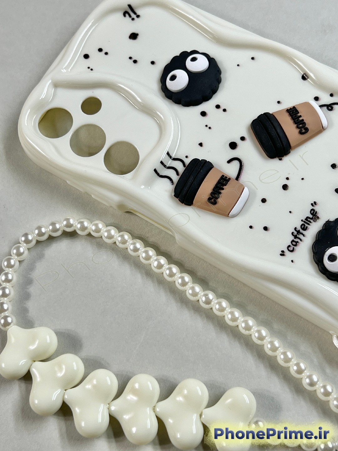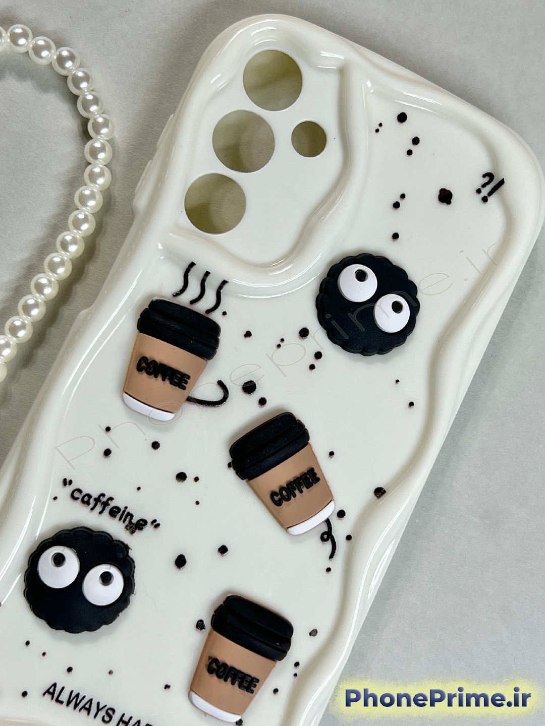قاب سامسونگ A15 مدل فانتزی آویزدار مرواریدی ، طرح قهوه و لیوان | بدنه سفید با عروسکهای برجسته بدون تغییر رنگ (نقد و اقساط) samsung A15